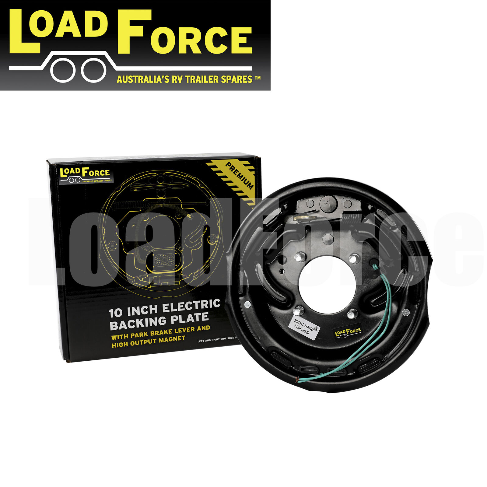 LoadForce 10 inch electric backing plate assembly with park brake lever. Right Hand. Retail boxed. Requires 4 of NN716UNF nyloc nuts for fitment. The LoadForce backing plates are Australian design some times referred to as AL-KO type and are directly interchangeable with AL-KO and also the American style backing plates such as Dexter.